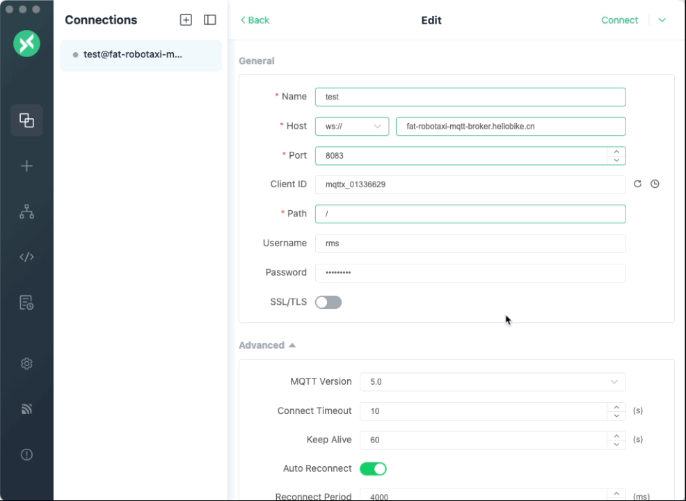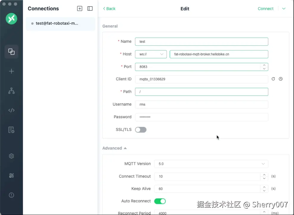 /mqtt,可以使用 MQTTX 这样的客户端进行连接查看,如下面的动图所示。可以看到如果 path 是/时连接失败,但是当修改 path 为/mqtt时他连接成功了。