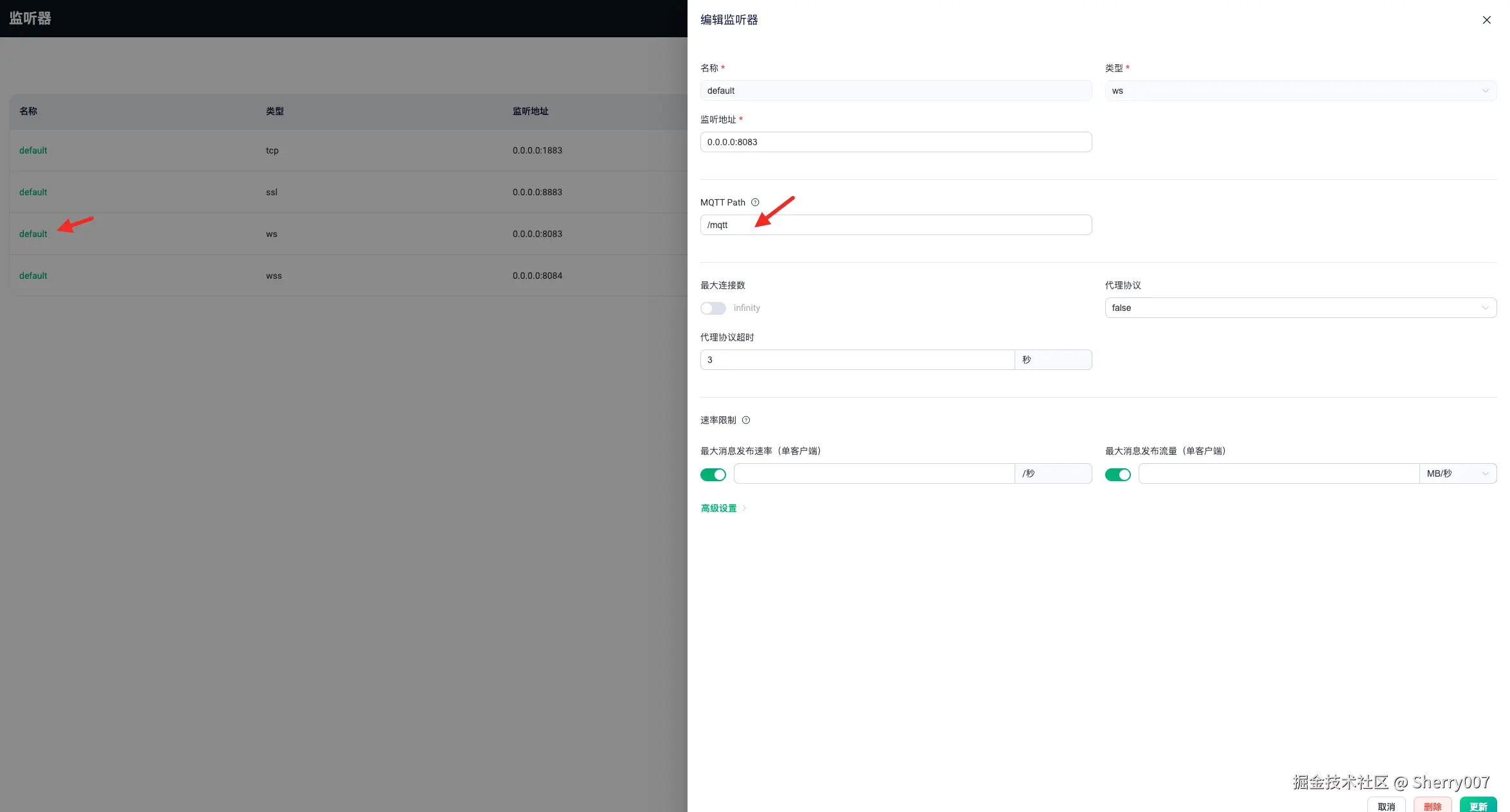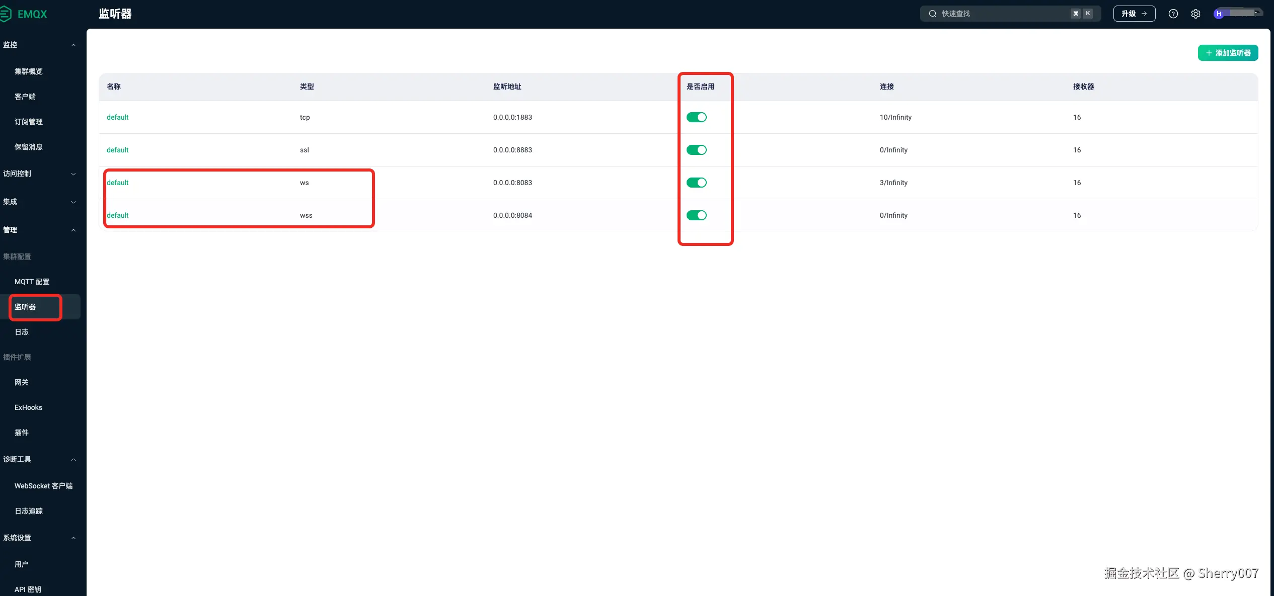 /mqtt还是连接不上,需要去查看一下你们所使用的mqtt broker的配置,比如我们是使用 EMQX,那我们可以去云平台配置中查看,如下图所示。我们需要关注两个点:- ws/wss 协议有没有被启用 - 如果没被启用那我们肯定连接不上