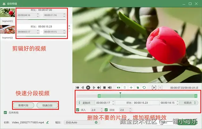 第3步:按下结束录制按钮后,我们会来到预览页面,在这里可以进行简单的视频剪辑。如果你想一键式分段视频,可以点击打开 “高级剪辑” 进行操作。