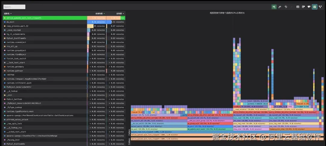 从热点火焰图上我们看到热点最高的是native_queued_spin_lock_slowpath函数,初步判断这是等锁,是受害者第一现场,点击热点函数,火焰图中可以高亮显示。