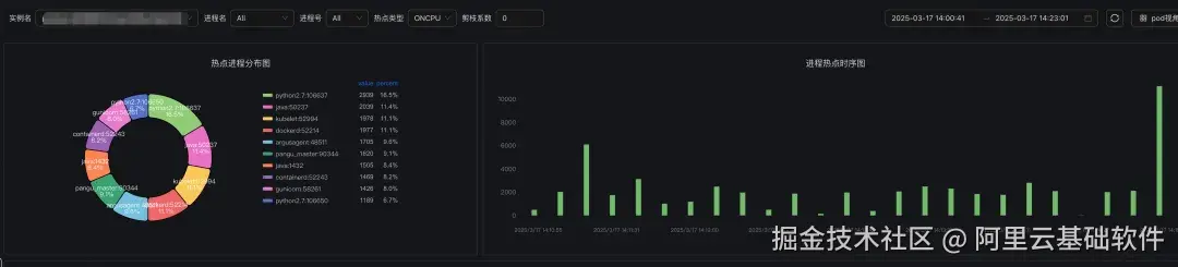线上问题往往具有偶发性或短暂性,当问题出现时,等到手动执行perf等诊断工具,可能已经错过了最佳诊断时机,无法捕捉到问题发生时的第一现场。因此,我们通过一系列先进的技术手段,实现了进程热点追踪的常态化采集。这一采集机制对系统资源的消耗极低,几乎不会对正常业务运行产生影响。借助 SysOM 进程热点追踪功能,当业务出现历史抖动或其他异常时,无需人工手动登录机器或实时值守,即可随时查看过往时间段内进程的运行状态,快速定位问题根源,提升运维效率。
