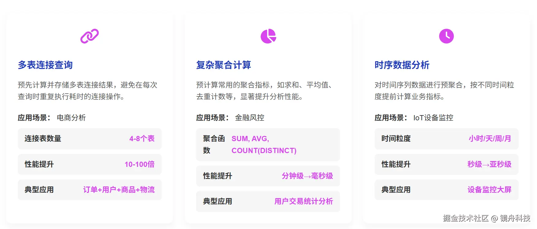 在实时分析场景中,物化视图同样发挥着关键作用: