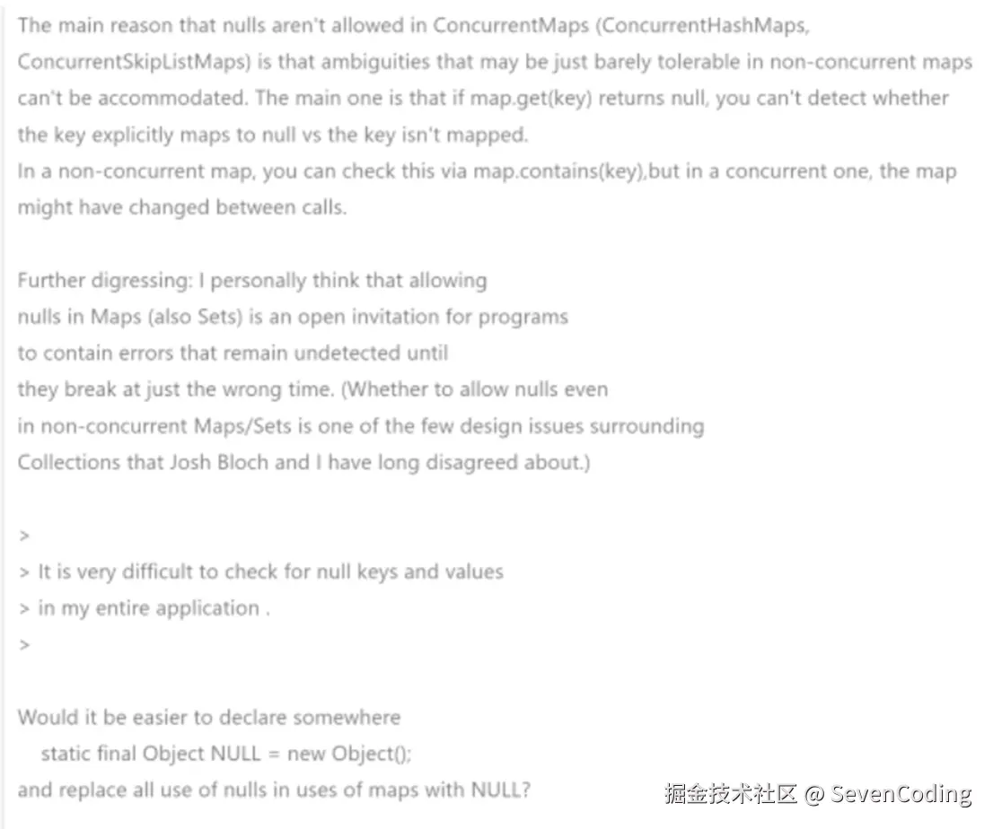 但是,像ConcurrentHashMap,它是为并发而生的,它是要用在并发场景中的,当我们map.get(key)返回null的时候,是没办法通过map.contains(key)(ConcurrentHashMap有这个方法,但不可靠)检查来准确的检测,因为在检测过程中可能会被其他线程锁修改,而导致检测结果并不可靠。