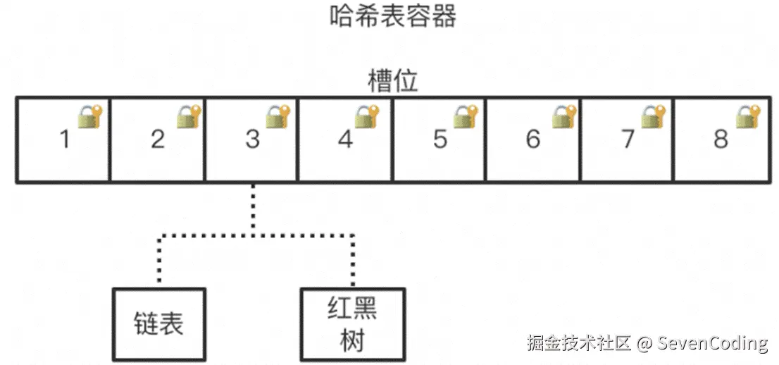如何高效的执行并发操作:根据上面hashMap的数据结构可以直观的看到,如果以整个容器为一个资源进行锁定,那么就变为了串行操作。而根据hash表的特性,具有冲突的操作只会出现在同一槽位,而与其它槽位的操作互不影响。基于此种判断,那么就可以将资源锁粒度缩小到槽位上,这样热点一分散,冲突的概率就大大降低,并发性能就能得到很好的增强。