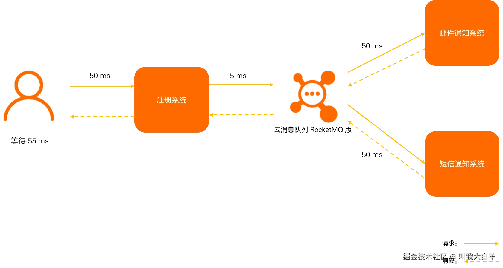 对于注册系统而言,发送注册成功的短信和邮件通知并不一定要绑定在一起同步完成,所以实际当数据写入注册系统后,注册系统就可以把其他的操作放入对应的 RocketMQ 中然后马上返回用户结果,由 RocketMQ 异步地进行这些操作。