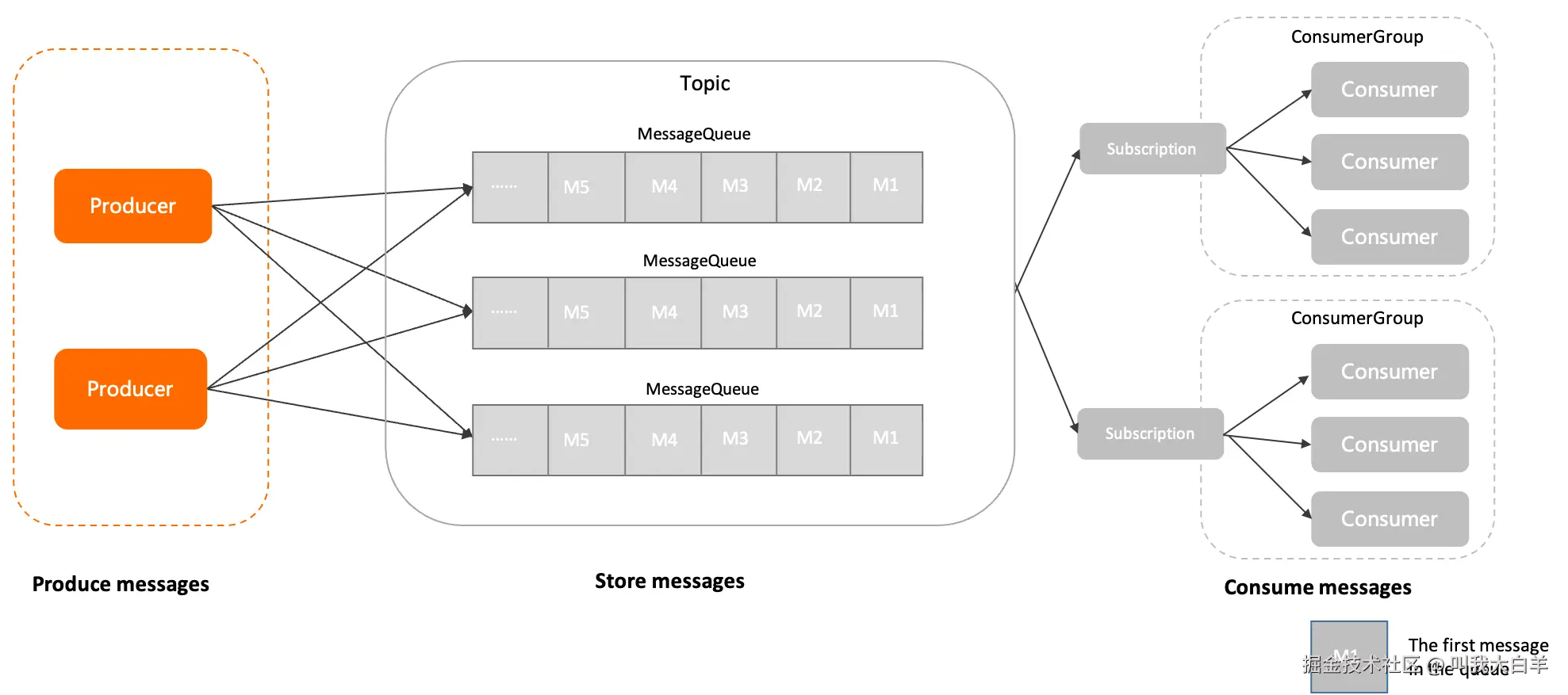 发布消息的角色。Producer 通过 MQ 的负载均衡模块选择相应的 Broker 集群队列进行消息投递,投递的过程支持快速失败和重试。