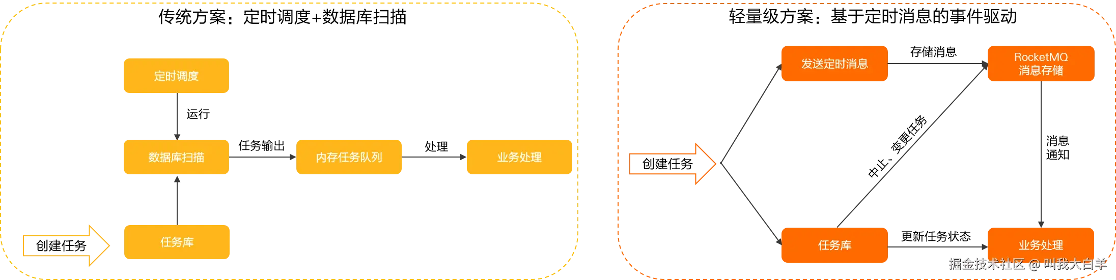 - 高性能、可扩展:传统的定时实现方案较为复杂,需要进行数据库扫描,容易遇到性能瓶颈的问题,RocketMQ 可以基于定时消息特性完成事件驱动,实现百万级消息 TPS 能力。