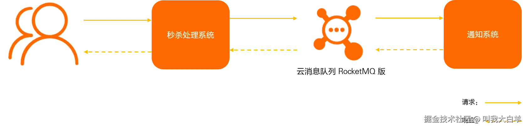 在秒杀或团队抢购活动中,由于用户请求量较大,导致流量暴增,秒杀的应用在处理如此大量的访问流量后,下游的通知系统无法承载海量的调用量,甚至会导致系统崩溃等问题而发生漏通知的情况。为解决这些问题,可在应用和下游通知系统之间加入 RocketMQ。