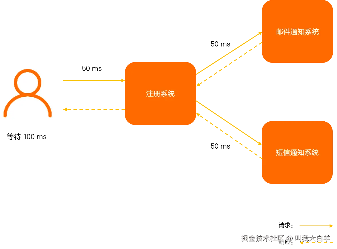 假设每个任务耗时分别为50ms,其中,邮件和短信通知并行完成,则用户需要在注册页面等待总共100ms才能登录。