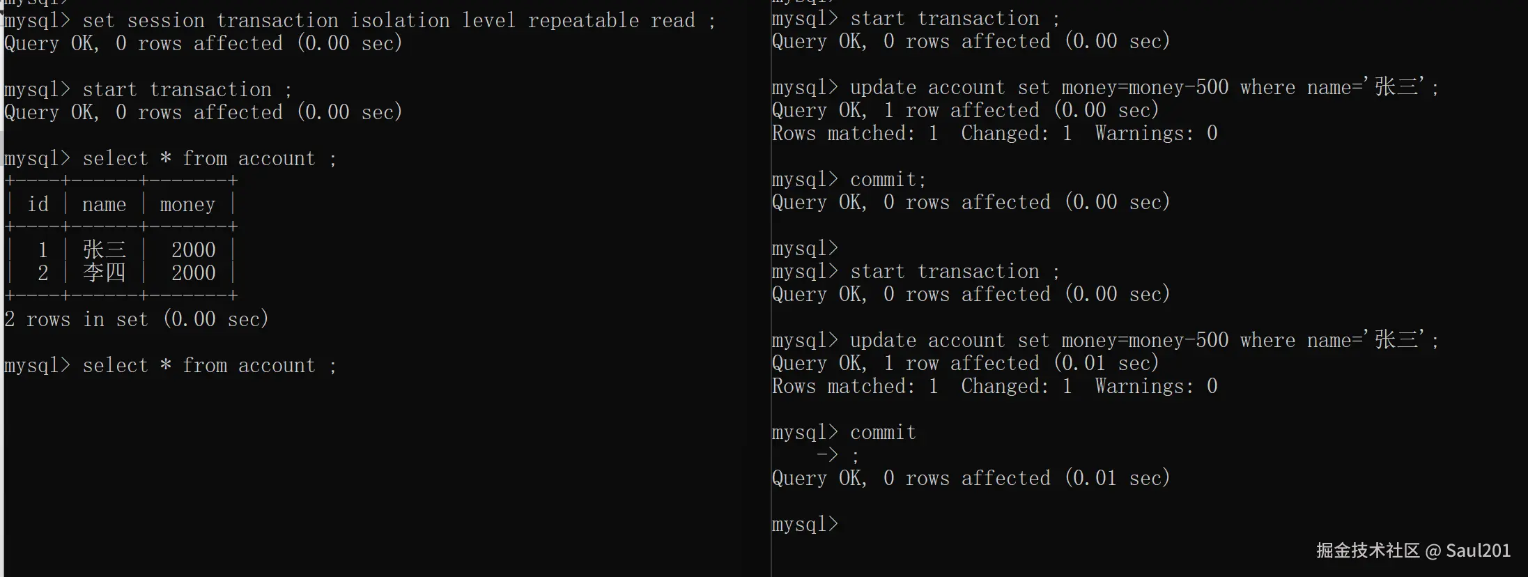update account set money = money - 500 where name = '张三';