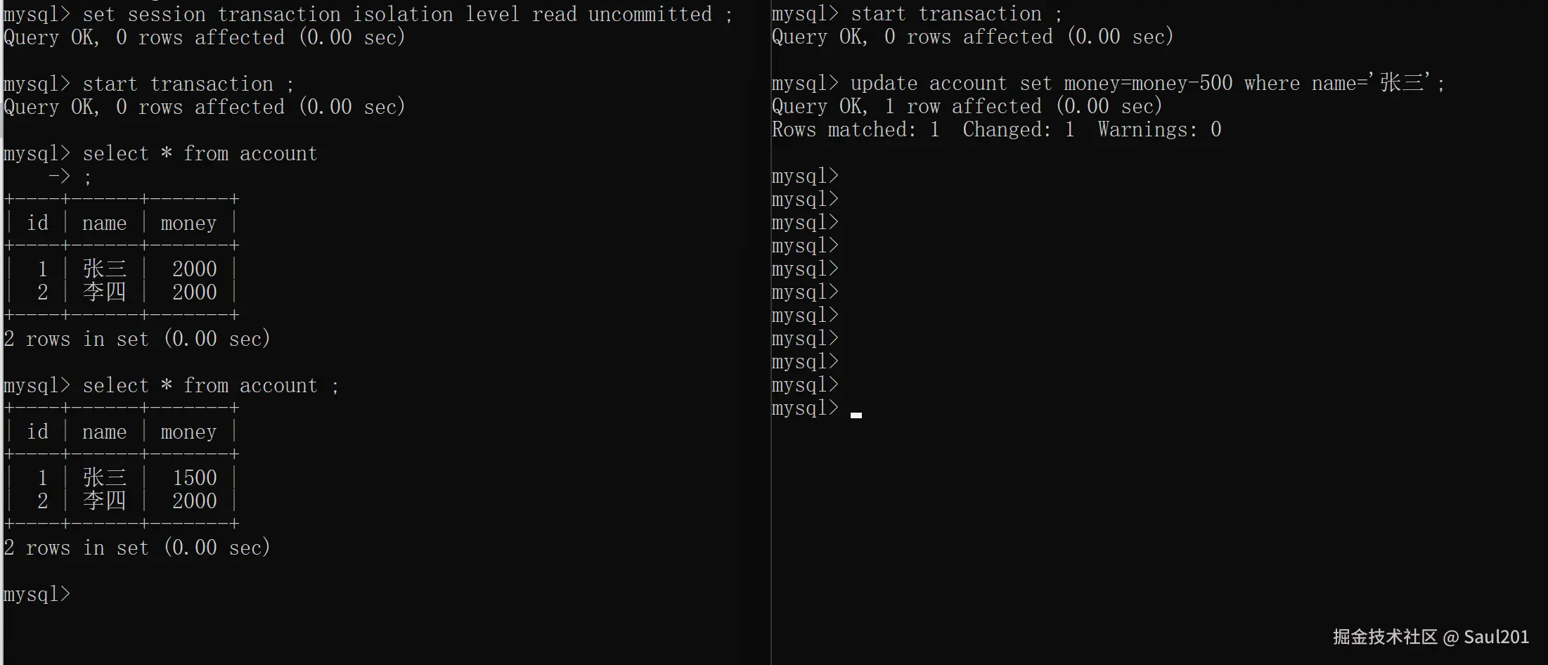 -- 设置事务隔离级别为: read uncommitted