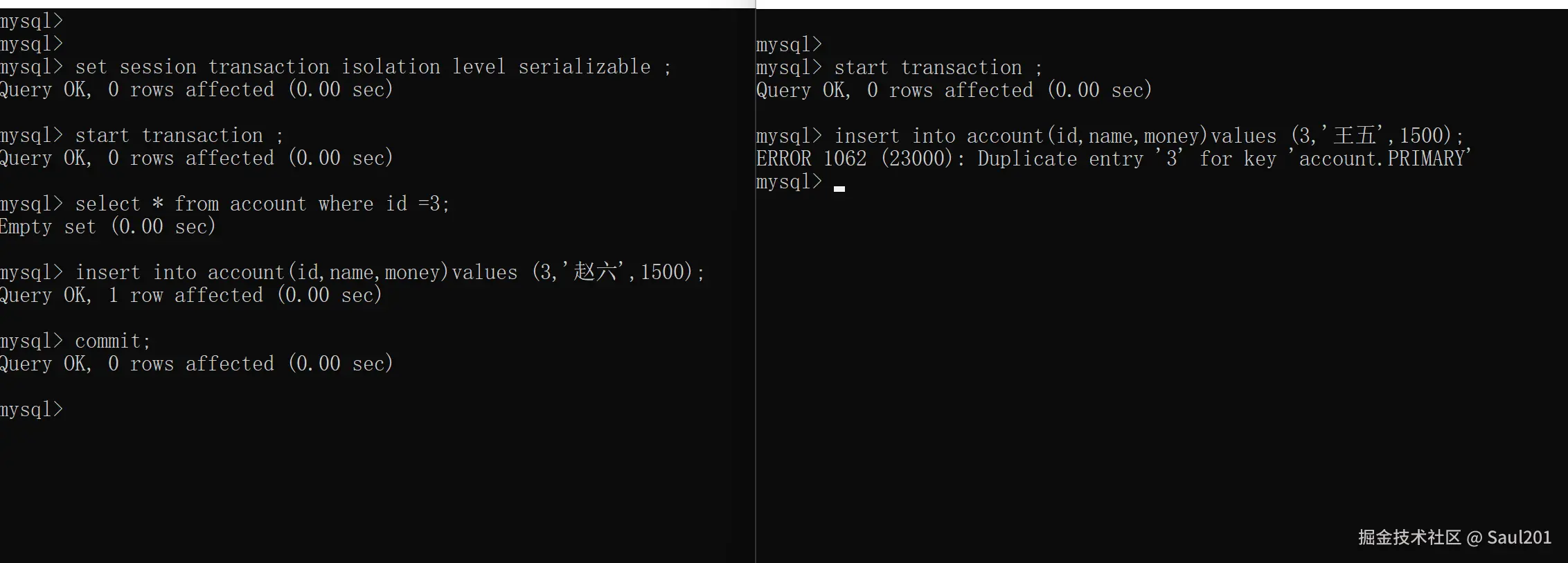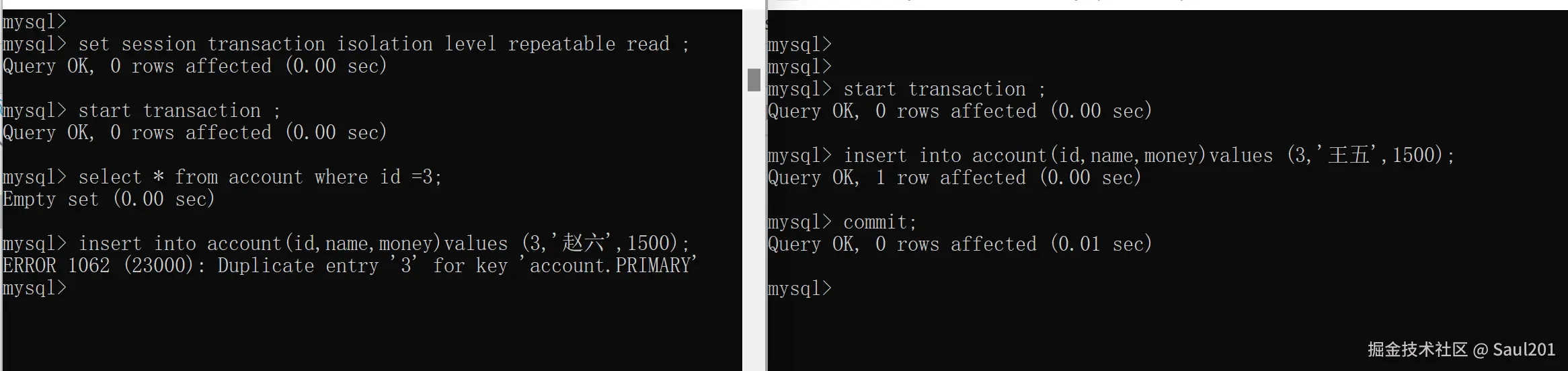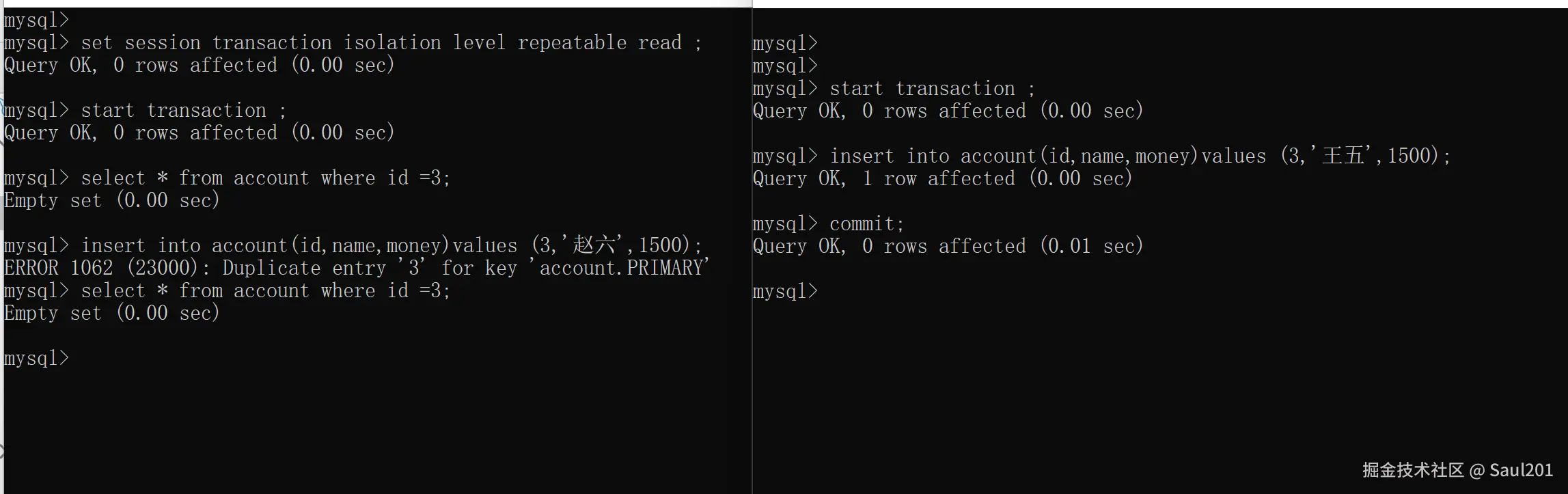 -- 事务A提交事务后,事务B执行,出现报错:id为3数据已经存在