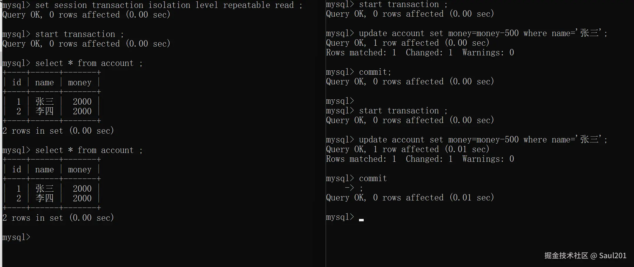 -- 设置事务隔离级别为: repeatable read