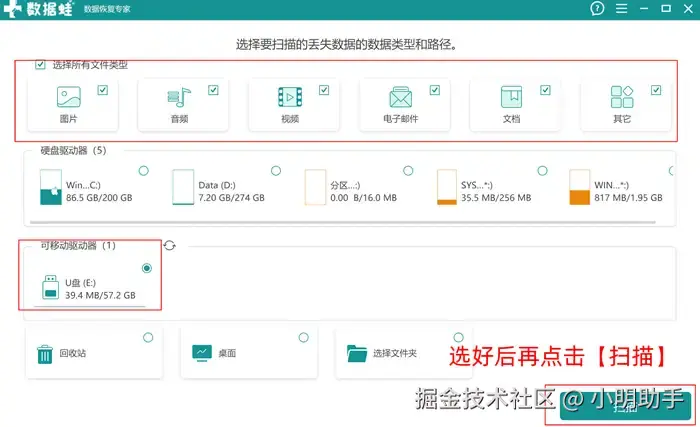 步骤1:打开数据 蛙恢复专家,在首页上我们可以选择文件类型和扫描的U盘,点击【扫描】;