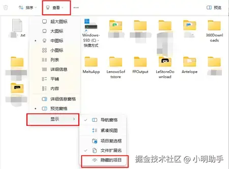 点击U盘,在里面的文件资源管理器上点击【查看】,再点击【显示】,最后看见【隐藏的项目】后,点击就能让隐藏文件回来了。