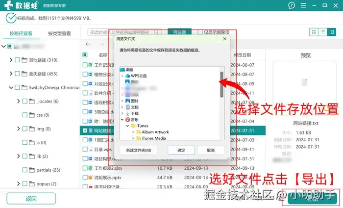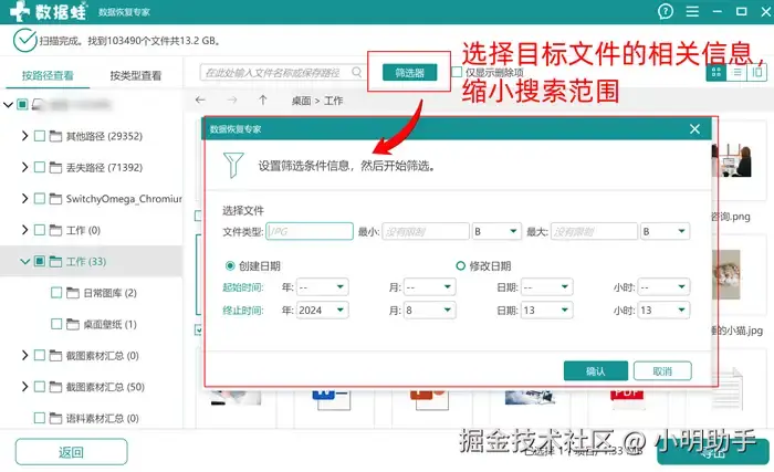 步骤2:扫描结束后,我们可以在指定的位置上选择自己需要的文件。但是扫描的文件过多,可以使用【筛选器】将搜索范围缩小,更容易找到目标文件;找到后点击【导出】;