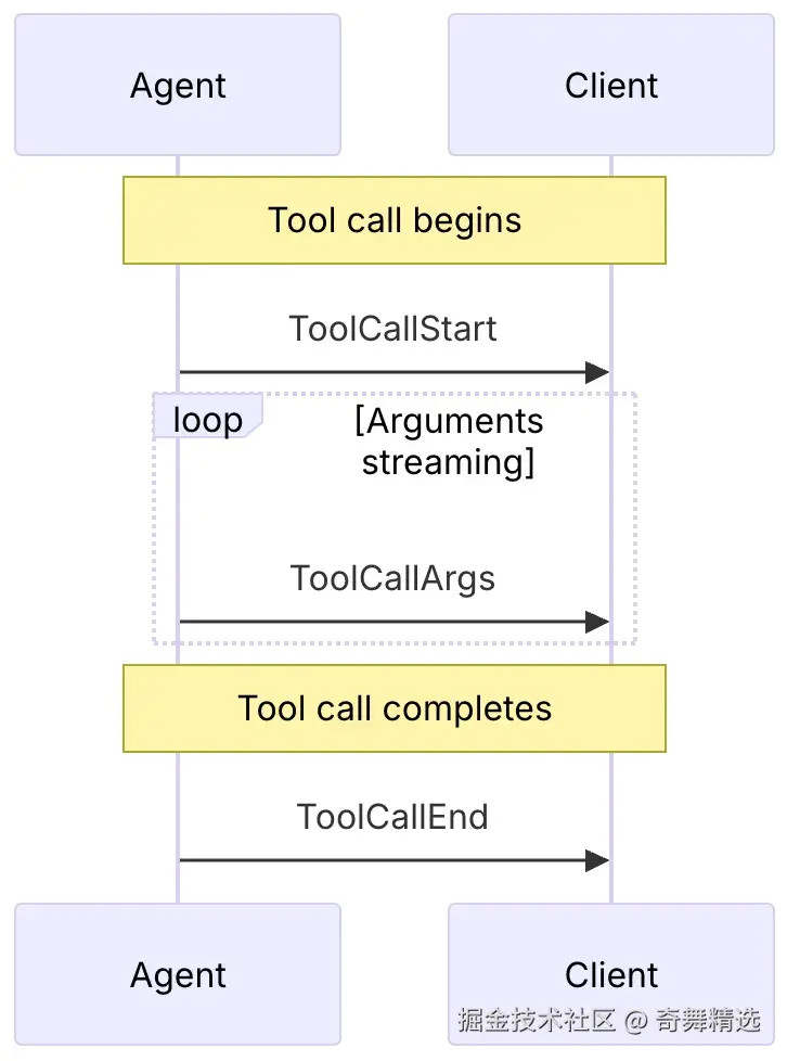 TEXT_MESSAGE_START,TEXT_MESSAGE_CONTENT,TEXT_MESSAGE_END),处理文本流式内容的事件。 - 工具调用事件(如