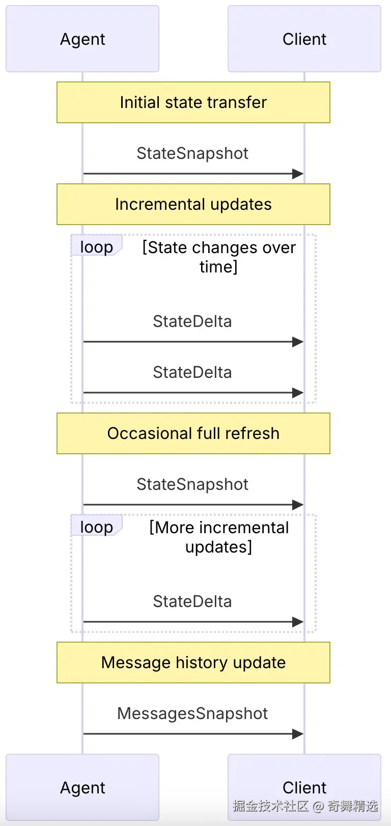 STATE_SNAPSHOT,STATE_DELTA),同步 Agent 和 UI 之间的状态。 - 特殊事件(如