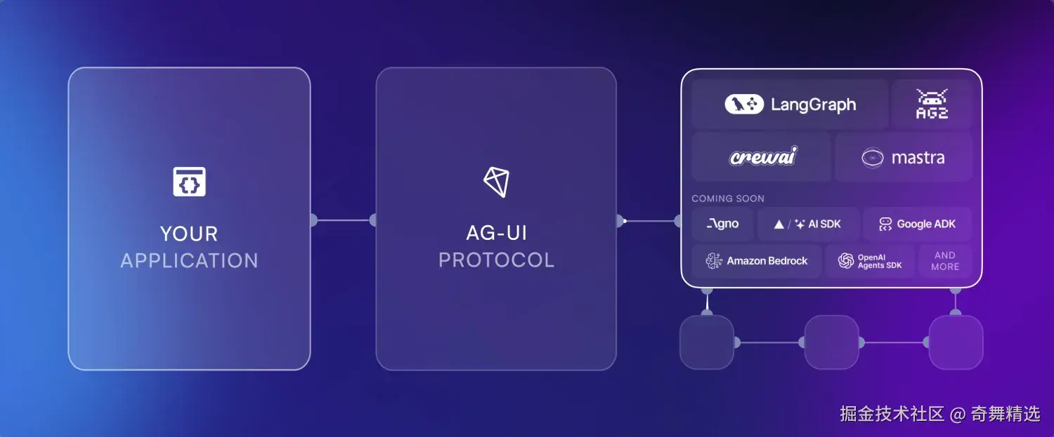 - AG-UI:主要处理由用户(人)参与的交互以及流式更新用户界面;