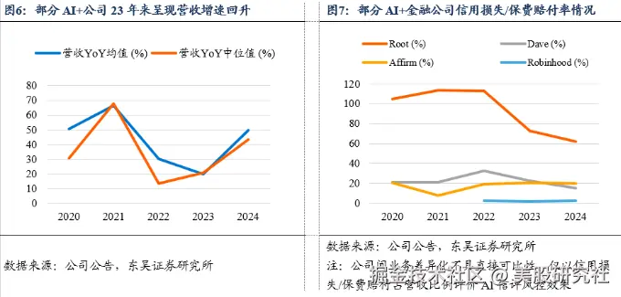 参考美股AI公司产生营收的途径,基本都是有效地帮助客户实现降本增效,并且能够以具体经营指标来衡量,比如AI+金融类公司在Root(车险)、Dave(先买后付)领域的信用损失/保费赔付率最高降低了50%以上、信评/贷前管理水平能否相较于同等人力下增加30%、SG&A费率平均能否下降超过10个百分点、总资产周转率倍数能否平均提升0.2、毛/净利率是否能平均提升20%和60%。最终这些降本增效指标如果能提升,客户就会给百融云更高的take rate和分润,类似于百融云的整体毛利率从2023年的72.91%提升至2024年的73.11%。