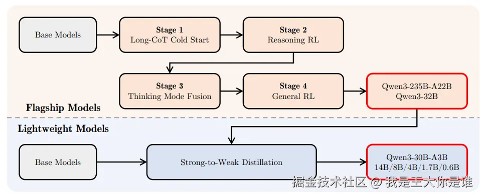 Qwen3 系列的旗舰模型遵循一个复杂的四阶段训练过程。前两个阶段专注于发展模型的“思考”能力。接下来的两个阶段旨在将强大的“非思考”功能集成到模型中。