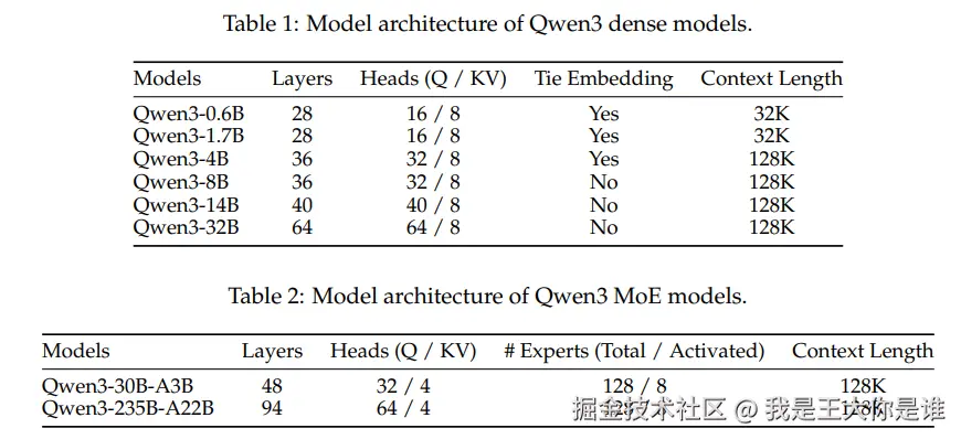 Qwen3密集模型的架构与 Qwen2.5 类似,包括使用 GQA 、SwiGLU 、RoPE 和预归一化的 RMSNorm 。此外,我们删除了Qwen2 中使用的 QKV-bias ,并在注意力机制中引入了QK-Norm 以确保 Qwen3 的稳定训练。