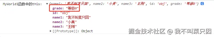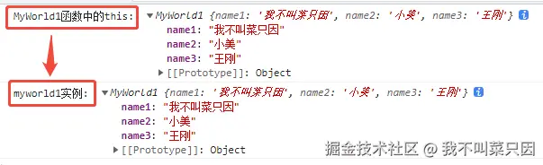 1. MyWorld1 构造函数中的 this 在被 new 调用后,就指向了新创建的实例对象 myworld1。