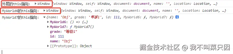 console.log('MyWorld6的this指向: ', this) // 外层的this是window