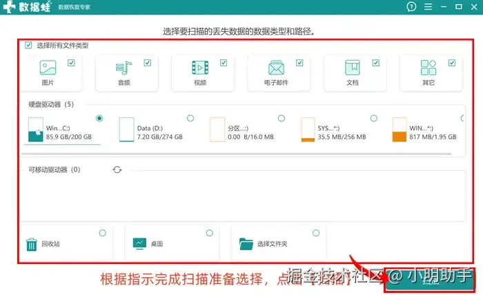 步骤1: 从电脑装好软件并打开数据 蛙恢复专家,开启软件首页后,在页面的上方可以选择需要恢复的文件类别,再选择需要扫描的地方,别忘了点击【扫描】按键;