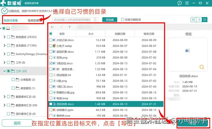 步骤2: 在软件的扫描文件列表中,根据文件的信息选择目标文件,点击【导出】;