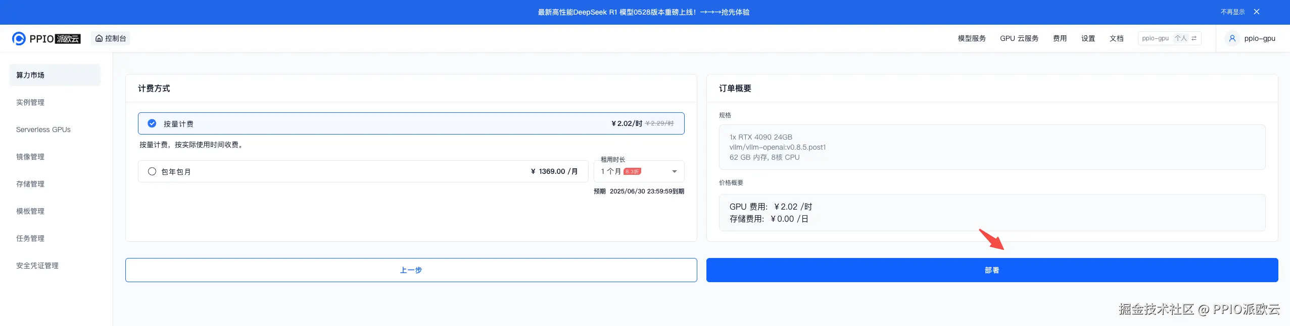 打开PPIO派欧云算力市场,选择 deepseek-ai/DeepSeek-R1-0528-Qwen3-8B 模版,选择卡型 4090 点击部署。