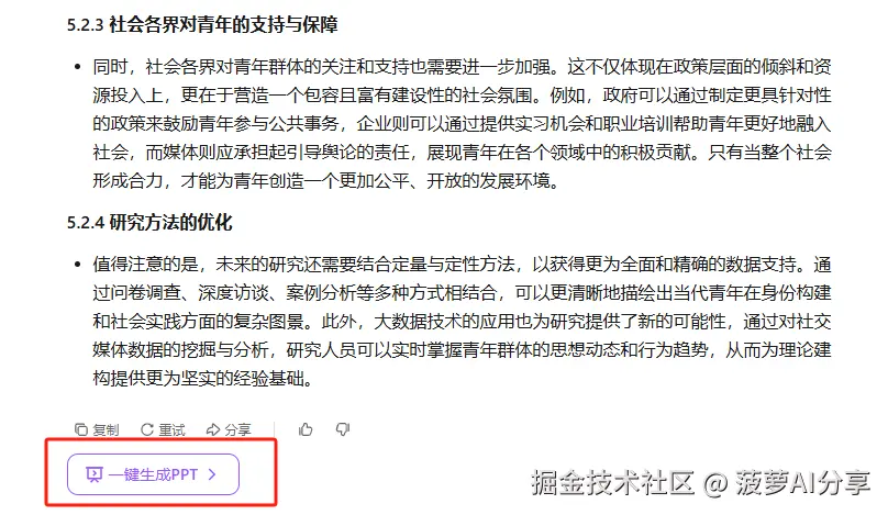 但是如果你使用之后还会发现它有一定的缺陷,就比如提炼的论文核心内容过长,没有重点,五分钟之内压根讲不完,需要删减。还没有生成配套的自述稿,用户拿到手之后不知道怎么讲,照着PPT读那可就太丢分了!