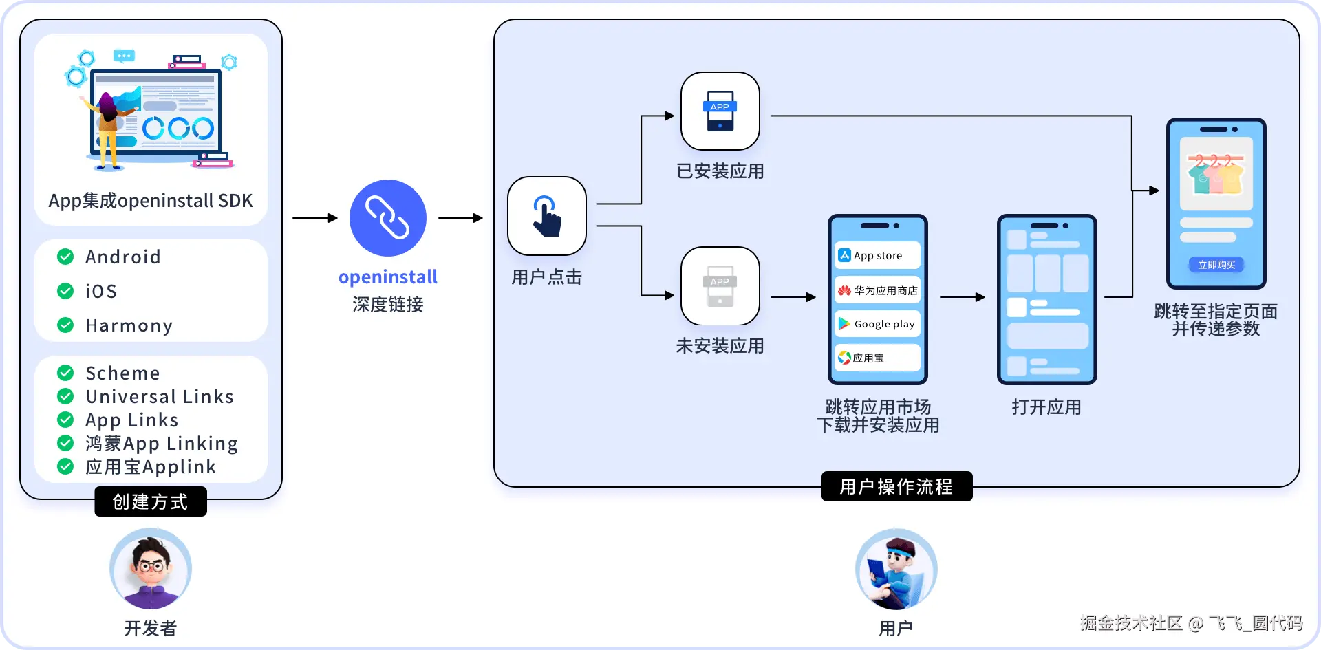 **1、所有DeepLink方案一站式集成:**openinstall集成了上述提到的各种深度链接方案,国内外均适配Universal Links与URL Scheme,国内同时提供应用宝Applink以及鸿蒙App Linking,海外兼容谷歌App Links等最先进和通用的DeepLink方案,真正做到全球深度链接一站式通用。