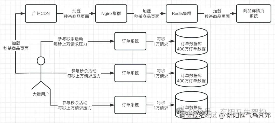 假设运营花了很多钱做活动拉新用户,APP的日活用户一直在增长。现在每天在高峰时间段开启的秒杀活动,已经比以前有更多的用户在参与了。当特价商品的秒杀时间一到,就有大量的并发请求过来,给订单系统带来非常大的压力。