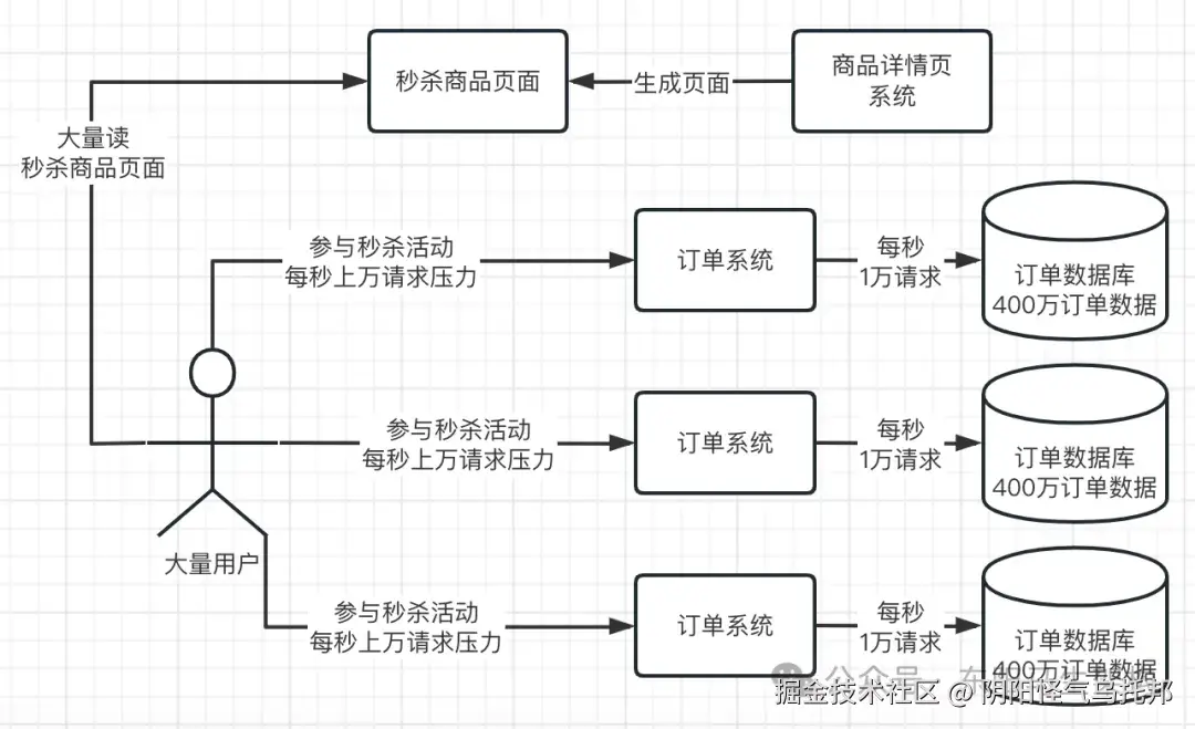 假设有10万用户在这个时间段很活跃都在购买商品。但可能只有其中1万用户在参与秒杀活动,在同一时间发送了大量的抢购请求到订单系统。而剩余的9万其他用户这时并不参与秒杀活动,他们在进行其他商品的常规性浏览和下单。