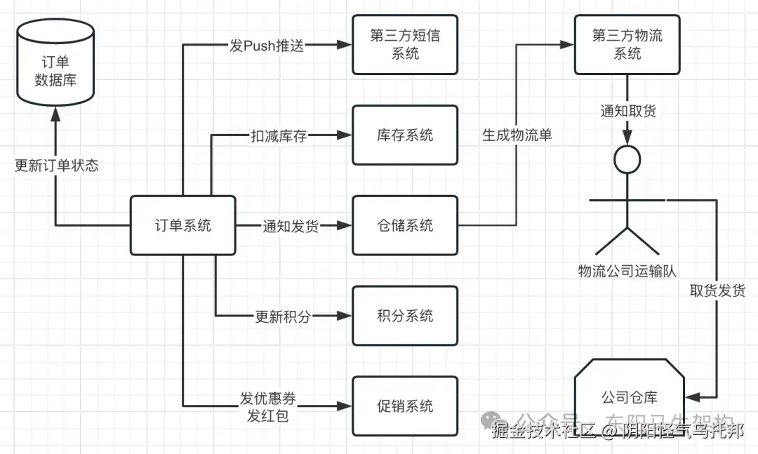 订单系统每次支付完一个订单后,都会执行一系列动作,包括:更新订单状态、扣减库存、增加积分、发优惠券发红包、发短信推送、通知发货。