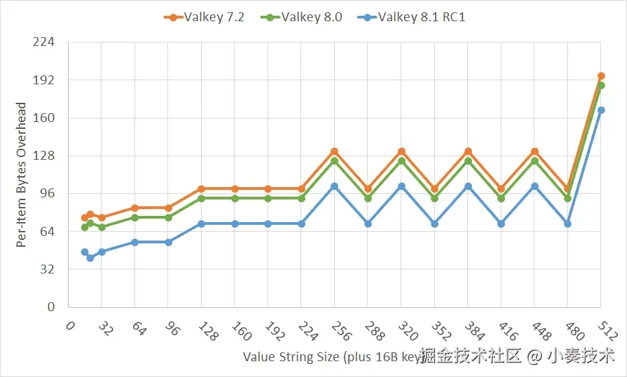 不同值大小下的 Valkey 内存开销 | 越低越好