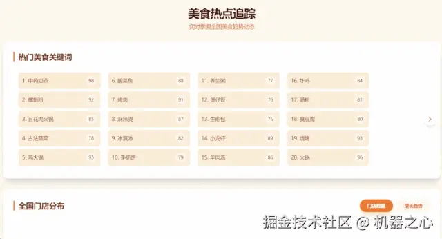 一个热点美食追踪的网站,详细区分了品类、门店详情等页面,包含门店覆盖热力图: