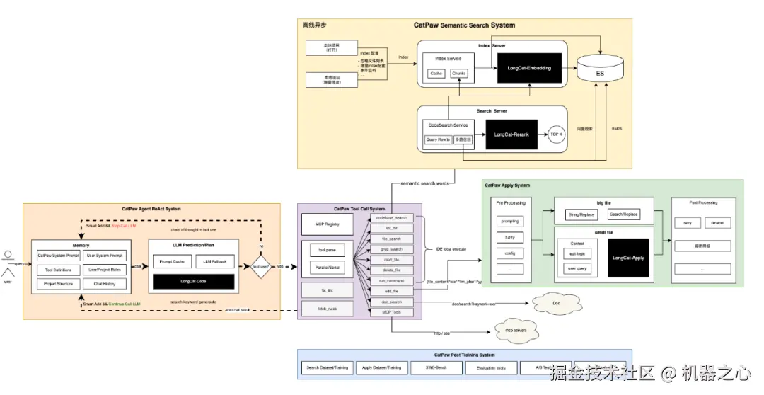 切换到 Dev Mode 之后,用户视图转变为完整的 Agentic IDE — CatPaw,适用于专业用户进行更精细化控制。CatPaw 于 2022 年 11 月启动,当时名字叫做 MCopilot,后来我们认为 Copilot 这个词不太好,改名 CatPaw,目前在美团内部研发的渗透率超过 90%,这部分技术架构,细节更为复杂,后续有机会单独分享。