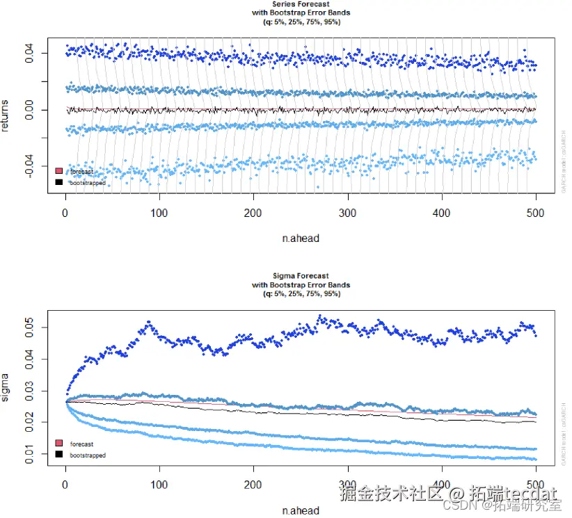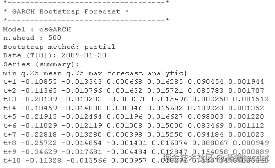 2 种类型的预测。一种滚动方法,其中基于拟合例程中设置的 out.sample 选项创建连续 1-ahead 预测,以及用于 n>1 超前预测的无条件方法。(也可以将两者结合起来创建一个相当复杂的对象)。在后一种情况下,也可以使用 Pascual 等人描述的 bootstrap程序。 bootstrap 方法基于从拟合模型的经验分布中重新采样标准化残差,以生成序列和 sigma 的未来实现。实现了两种方法:一种通过模拟和重新拟合建立参数的模拟分布来考虑参数不确定性,另一种只考虑分布不确定性,从而避免昂贵且冗长的参数分布估计。在后一种情况下,1-ahead sigma 预测的预测区间将不可用,因为在这种情况下,只有参数不确定性与 GARCH 类型模型相关。