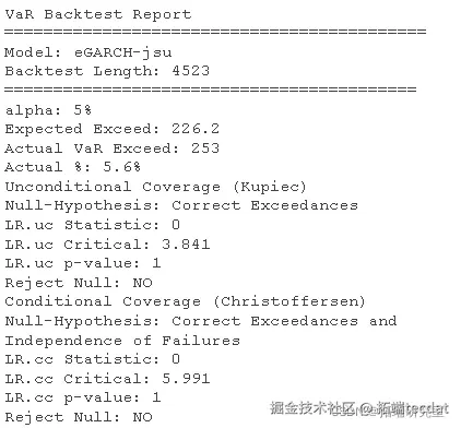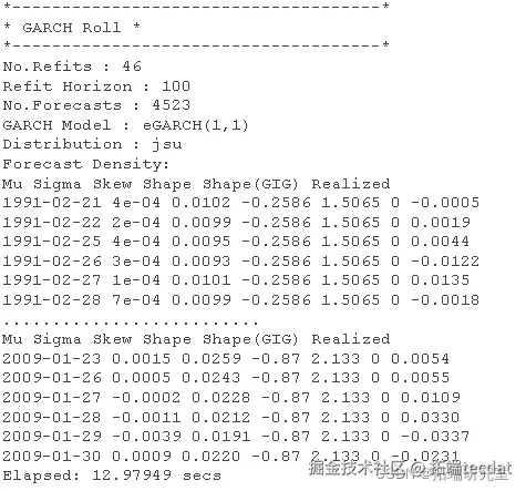 对模型/数据集组合执行滚动估计和预测,可选择返回指定水平的 VaR。更重要的是,它返回计算预测密度所需的任何度量所必需的分布预测参数。以下示例说明了该方法的使用,其中还使用了并行功能并在 10 个内核上运行。