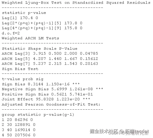 Q-statistics 和 ARCH-LM 检验已被 Fisher 和 Gallagher (2012) 的 Weighted Ljung-Box 和 ARCH-LM 统计量取代,这更好地说明了来自估计模型。ARCH-LM 检验现在是一个加权组合检验,用于检验充分拟合的 ARCH 过程的原假设,而 Ljung-Box 是另一个组合检验,其 ARMA 拟合的充分性为零。signbias 计算 Engle 和 Ng (1993) 的 Sign Bias Test,也显示在摘要中。这测试了标准化残差中杠杆效应的存在(以捕捉 GARCH 模型可能的错误指定),