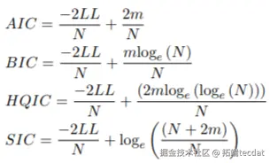 这是最佳分数的Hessian和协方差。稳健标准误差是 V 的对角线的平方根。拟合或过滤对象上的 inforcriteria 方法返回 Akaike (AIC)、贝叶斯 (BIC)、Hannan-Quinn (HQIC) 和 Shibata (SIC) 信息标准,以通过以不同速率惩罚过拟合来启用模型选择。形式上,它们可以定义为: