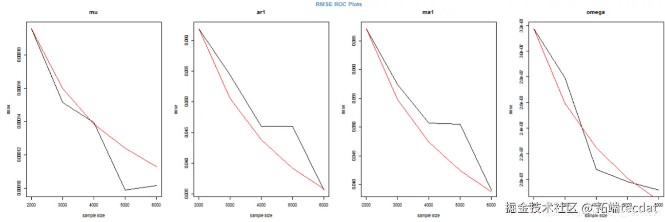但是,使用 100 个数据点来尝试拟合模型不太可能是一种合理的方法,因为您不太可能获得非常有效的参数估计。提供了一种方法(ugarchdistribution),用于从预先指定的模型、不同大小的数据进行模拟,将模型拟合到数据,并推断参数的分布以及作为数据长度的 RMSE 变化率增加。这是检查参数分布的一种计算成本非常高的方法(但在非贝叶斯世界中是唯一的方法),因此应谨慎使用并在有足够计算能力的情况下使用。