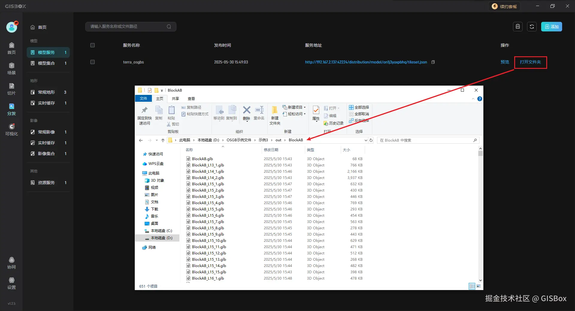 然后我们可以在“分发”中找到刚才切片完毕的文件,复制服务地址即可将其应用到Cesium、山海鲸可视化等平台中。