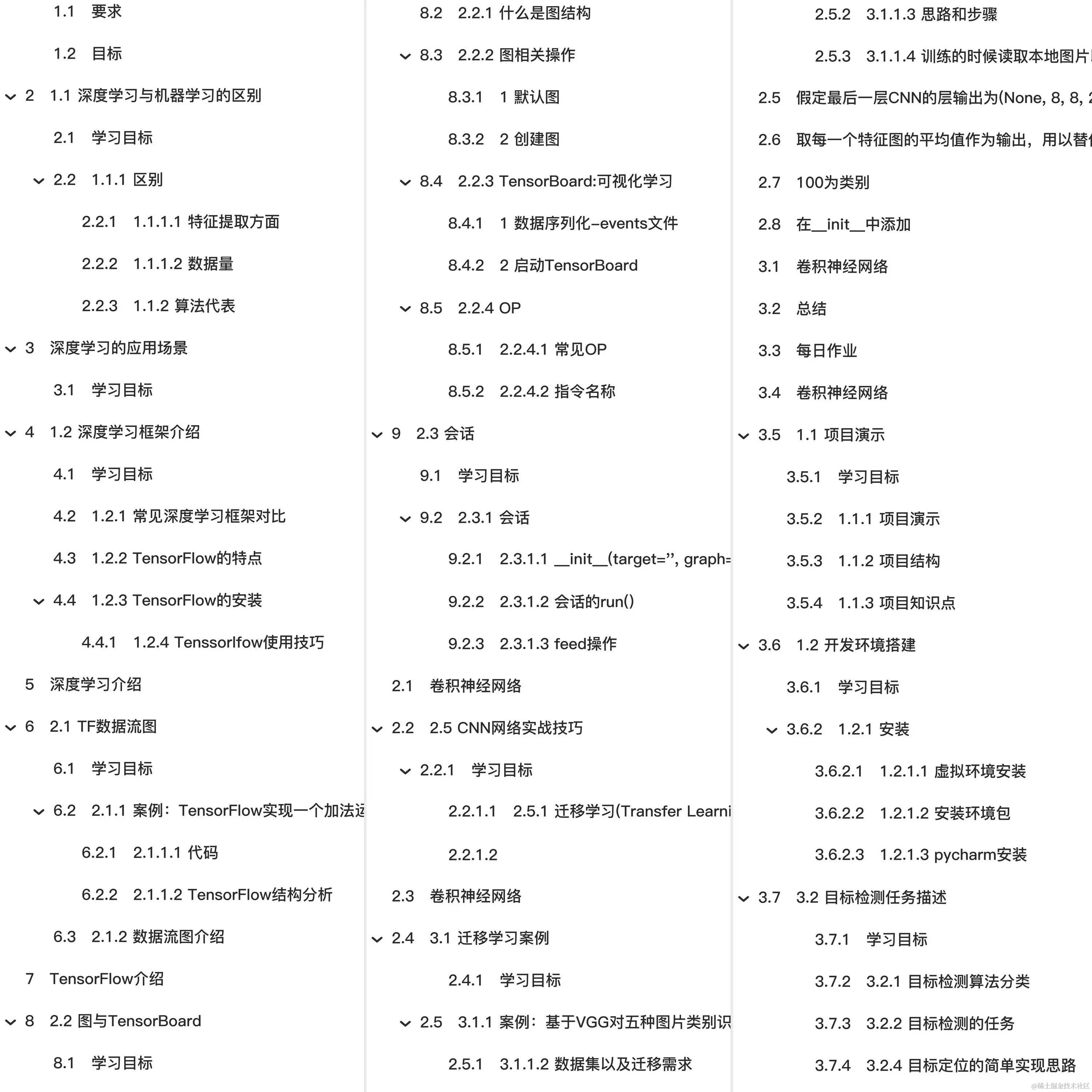 教程总体简介:要求 目标 1.1 深度学习与机器学习的区别 学习目标 1.1.1 区别 1.1.1.1 特征提取方面 1.1.2 算法代表 深度学习的应用场景 1.2 深度学习框架介绍 1.2.2 TensorFlow的特点 深度学习介绍 2.1 TF数据流图 2.1.1 案例:TensorFlow实现一个加法运算 2.2 图与TensorBoard 2.2.1 什么是图结构 2.2.2 图相关操作 1 默认图 2 创建图 2.2.4 OP 2.2.4.2 指令名称 2.3 会话 卷积神经网络 2.5 CNN网络实战技巧 3.1 迁移学习案例 3.1.1 案例:基于VGG对五种图片类别识别的迁移学习 3.1.1.2 数据集以及迁移需求 3.1.1.3 思路和步骤 3.1.1.4 训练的时候读取本地图片以及类别 假定最后一层CNN的层输出为(None, 8, 8, 2048) 取每一个特征图的平均值作为输出,用以替代全连接层 100为类别 在__init__中添加 1.1 项目演示 1.2 开发环境搭建 3.2 目标检测任务描述 3.2.4 目标定位的简单实现思路 商品物体检测项目介绍 3.3 R-CNN 3.3.1 目标检测-Overfeat模型 3.3.7 问题? 3.3.8 SPPNet 3.5 Faster R-CNN 3.5.2 RPN原理 3.5.4 效果对比 YOLO与SSD 3.6 YOLO(You only look once) 3.6.1 YOLO 3.6.2 单元格(grid cell) 3.6.3 非最大抑制(NMS) 3.6.4 训练 3.7 SSD(Single Shot MultiBox Detector) 3.7.1 SSD 问题:SSD中的多个Detector & classifier有什么作用? 3.7.2 训练与测试流程 SSD网络接口实现 4.3 案例:SSD进行物体检测 4.3.1 案例效果 4.3.3 步骤分析以及代码 循环读取图片进行多个图片输出检测 预测 定义BBox工具 使用非最大抑制算法过滤 5.1 项目训练结构介绍 5.1.1 项目目录结构 商品检测数据集训练 5.2 标注数据读取与存储 5.2.1 案例:xml读取本地文件存储到pkl 5.2.1.1 解析结构 one_hot编码函数 5.3 训练 5.3.3 多GPU训练代码修改 5.4 本地预测测试 5.4.1 预测代码 5.6 Web与模型服务对接逻辑 5.5 模型导出 5.4.1 keras 模型进行TensorFlow导出 Docker部署环境使用介绍 5.7 TF Serving 与 Web开启服务 4.8.2 安装Tensorflow Serving 5.7.2 案例操作:commodity模型服务运行 TensorFlow Client对接模型服务 Web Server开启 模型导出与部署 2.4 张量 2.4.1 张量(Tensor) 2.4.1.1 张量的类型 2.4.4 张量的数学运算 2.5 变量OP 2.5.1 创建变量 2.5.2 使用tf.variable_scope()修改变量的命名空间 2.7 案例:实现线性回归 2.7.1 线性回归原理复习 2.7.3 增加其他功能 2 增加命名空间 3 模型的保存与加载 4 命令行参数使用 完整代码 1.2 神经网络基础 tf.keras介绍 神经网络与tf.keras 1.4 深层神经网络 3.1 卷积神经网络(CNN)原理 2.2案例:CIFAR100类别分类 2.2.2 API 使用 2.2.3 步骤分析以及代码实现(缩减版LeNet5) 2.2 梯度下降算法改进 2.4 经典分类网络结构 2.4.6 案例:使用pre_trained模型进行VGG预测