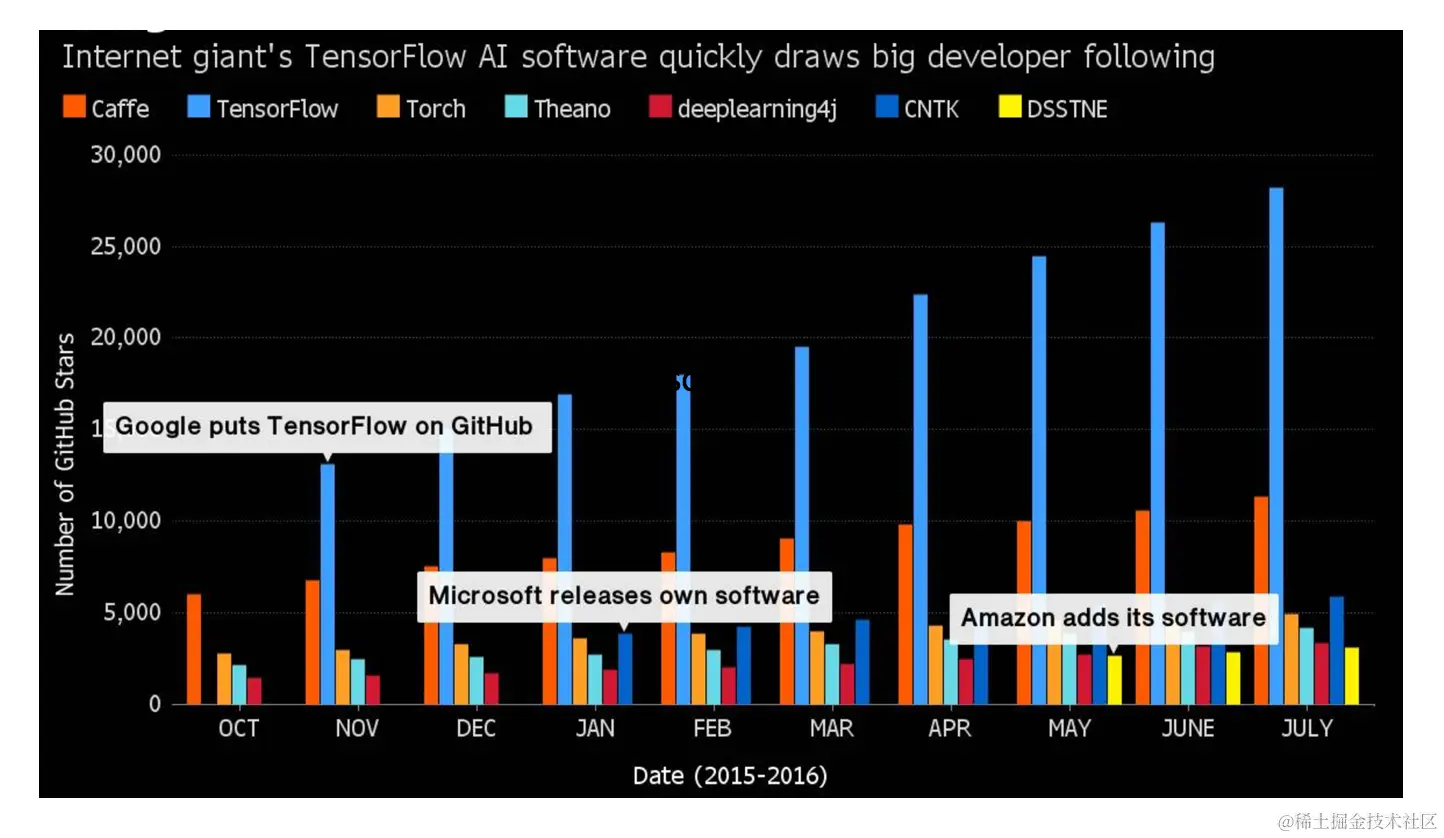 - TensorFlow使用C++实现的,然后用Python封装。谷歌号召社区通过SWIG开发更多的语言接口来支持TensorFlow