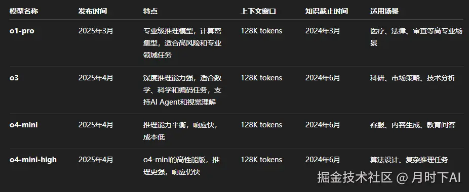 | o4-mini | 2025.04 | 推理能力平衡,响应快,成本低 | 128K tokens | 2024.06 | 客服、内容生成、教育问答 |