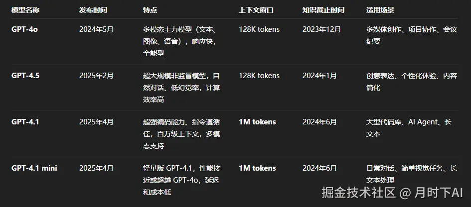 - GPT-4.1 在上下文窗口和代码能力上表现突出