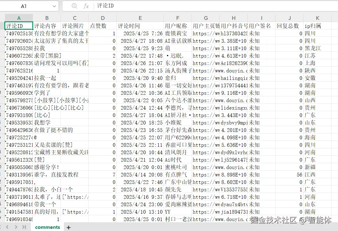 结构化输出: 将清洗后的数据整理成结构化格式(如 CSV 或 Excel 表格),包含评论内容、公开可见的点赞数、发布时间、公开显示的IP属地(如有)等基础字段。